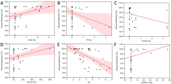 Correlations between beverage characteristics and percent reduction in virus titer at 1 h. Higher concentrations of sugar (A) and alcohol (D) correlate with greater reduction in virus titer by 1 h post-inoculation (p = 0.0378, and 0.0189, respectively). Increased percentage of fat (B) and higher pH (E) correlate with less reduction in virus titer by 1 h post-inoculation (p = 0.0478 and <0.0001, respectively. Shaded areas = confidence intervals (0.05). No correlation was found between protein (C) or caffeine (F) content and reduction in virus titer by 1 h post-inoculation (p > 0.05). Bivariate analysis, JMP.