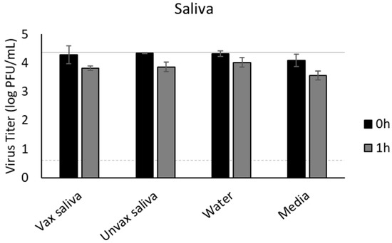 Survival of SARS-CoV-2 in saliva from vaccinated (vax saliva) and unvaccinated (Unvax saliva) individuals compared to water and media controls. SARS-CoV-2 was recovered immediately after inoculation (0 h) and at 1 h and 7 d after inoculation, quantified by plaque assay on Vero E6 cells, and shown as log PFU/mL. The inoculum is shown as a solid gray line (4.3 log PFU/mL) and the detection limit of the plaque assay is shown as a dashed line (0.7 log PFU/mL). No statistically significant differences were identified. Error bars = SEM.