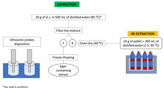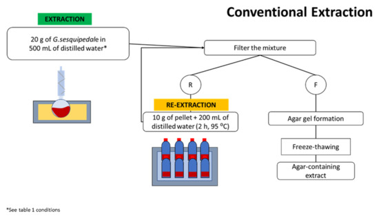 Afterwards, a re-extraction was performed on the residues from the previous extraction by soaking 10 g of the dried residue in 200 mL in distilled water during 2 h at 95 °C inside a water bath. After agar extraction, the mixture was processed as per the previously described processing procedures. The performed methodology is illustrated in Figure 1.