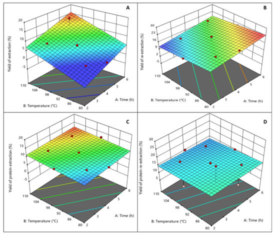 Equation (4) describes the relationship between the extraction time and temperature for the yield of the extraction, the yield of the re-extraction, the protein extraction, and the protein re-extraction. 3D surface plots illustrate the relationship between the yield of the extraction (Figure 3A), the yield of the re-extraction (Figure 3B), the protein extraction (Figure 3C), the protein re-extraction (Figure 3D), and the experimental variables—the time and temperature of the extraction.
