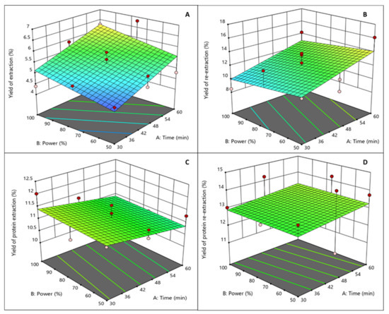 The four response dependent variables (yield of extraction (%), yield of re-extraction (%), protein extraction (%), and protein re-extraction (%)) for each run in the experimental design are listed in Table 2. The yield of extraction ranged from 4.39% to 6.82%; yield of re-extraction from 8.50% to 13.85%; the protein extraction from 10.12% to 12.02%; and the protein re-extraction from 11.16% to 14.56%. A linear model fitted the experimental data only in the case of the response of the yield of extraction, with low standard error (p < 0.01) and a coefficient of regression of 0.7436. It can be seen in Figure 4A that lower power led to lower yields, the same as what lower time led to lower yields. The models developed for the other responses did not show any significance, which could be explained because the parameters of the model were not chosen to optimize these responses (re-extraction, and protein extraction and re-extraction), and also because of the possible depolymerisation caused by ultrasound treatment [7]. The significance of the two experimental variables (time and power) that affect the extraction and re-extraction yields were determined by using Design Expert software. Regression analysis was performed on the experimental data and the coefficients of the model were evaluated for statistical significance using ANOVA analysis. 3D surface plots illustrate the relationship between the yield of extraction (Figure 4A), the yield of re-extraction (Figure 4B), the protein extraction (Figure 4C), the protein re-extraction (Figure 4D), and the experimental variables—the time of extraction and the ultrasound power. In Figure 4, graphical representations of each one of the models is illustrated.