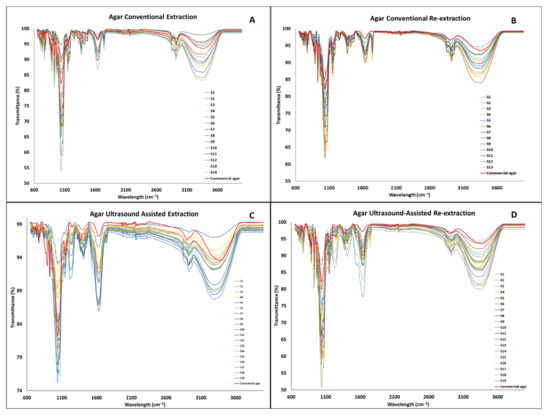 FT-IR spectra of the agar extracted by different methods ((A) agar conventional extraction, (B) agar conventional re-extraction, (C) agar ultrasound-assisted extraction, (D) agar ultrasound-assisted re-extraction).