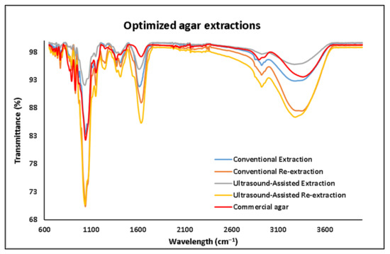 The spectral shape of all the agar extracts shown in Figure 5 and Figure 6 is similar to the commercial agar sample.