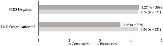 To allow for comparison with restaurants’ and bars’ expectations of their customers’ attitudes towards safety measures in food service businesses, the same factors were developed. McDonald’s omega values above 0.7 justified the calculation of composite variables of hygiene and avoidance measures at the level of businesses. Internal consistency for the organisational measures was lower (McDonald’s omega = 0.667), yet close to the threshold of 0.7 and still acceptable for exploratory research [59]. Surprisingly, businesses’ expectations of their customers’ attitudes towards safety measures in their businesses are significantly different from consumers’ stated attitudes (Figure 1). Independent samples t-tests indicated significantly lower mean scores for hygiene (t = 8.71; p < 0.001) and organisational measures (t = 3.91; p < 0.001) from the businesses’ perspective compared to the consumers’ perspective.