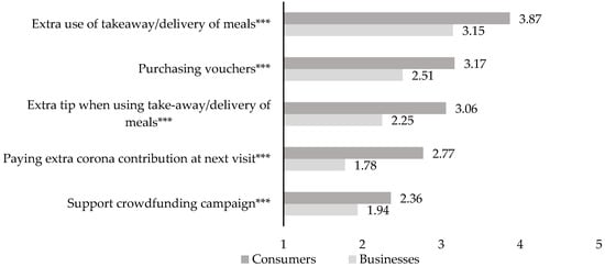 Further, not only is the Belgian federal government financially helping food service businesses to overcome the current crisis, but consumers are also very willing to make personal contributions to support the sector, even more than was expected by restaurants and bars. Consumers indicate that they are highly willing to financially support to help food service businesses to survive, contrary to the expectations of the food service sector. Previous studies argued that high levels of solidarity with the food service sector have a positive effect on consumers’ intention to visit restaurants and bars [34] and to continue using food delivery applications [54] during the COVID-19 pandemic; however, this situation-specific effect is expected to diminish over time. The notable discrepancy that was found between consumers’ solidarity intentions and businesses’ expectations provides knowledge and opportunities for businesses to facilitate their survival of the pandemic.
