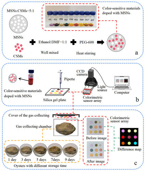 The assembly process of CSMs doped with MSNs (a), the schematic diagram of colorimetric sensor array system (b) and the difference map acquisition of oysters (c).