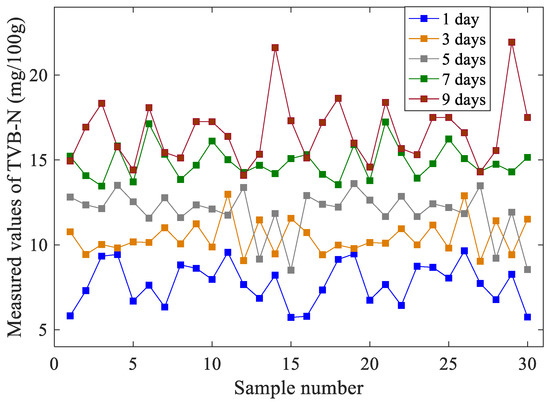As shown in Figure 2, as the storage time increased, the TVB-N values of oysters also increased, which was proportional to the freshness of oysters. However, there was a certain overlap between the TVB-N values of oyster samples with different storage days. This is because the individual oyster samples are independent and there are certain differences between them.