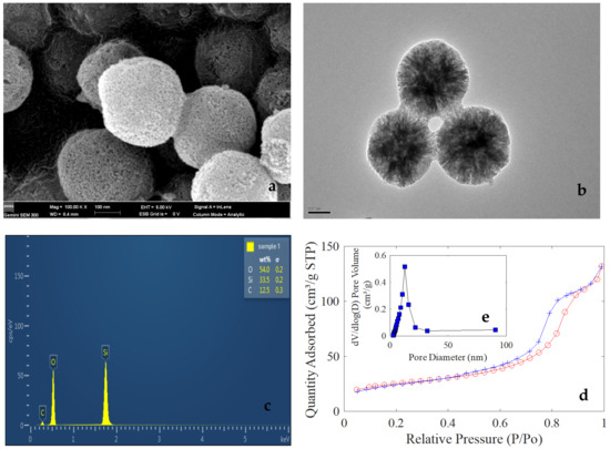 The SEM image of MSNs (a), TEM image of MSNs (b), EDS image of MSNs (c), adsorption–desorption hysteresis lines of MSNs (d), and the pore size distribution of MSNs (e).
