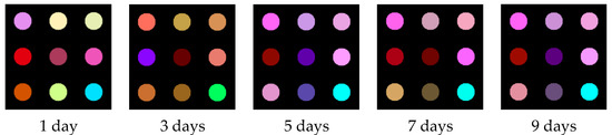 Average color-change profiles were obtained from oyster samples with different storage times. Figure 4 shows the difference maps of the VOCs of oyster samples with a storage time of 1, 3, 5, 7, and 9 days exposed to colorimetric sensor array doped with MSNs. As shown in Figure 4, the different maps of colorimetric sensor arrays with different storage-time oysters present different color difference maps (The difference map of the sensor array was obtained after superimposing the gray image of R, G, and B components: for example, changes in the B-component average values for the ninth nanocolorimetric-sensitive material-oyster samples stored for different days were 4.93, 24.02, 20.40, 26.07, and 23.03, respectively), and each dye has its specific fingerprint after the reaction with different samples. The difference map is an overall characterization of the overall VOCs of oysters. Since the VOCs of the oysters at 1, 3, and 5 days are constantly changing, the difference maps of these three days are constantly changing. With the increase in storage days, oysters were spoiled and there was a lot of TVB-N, for which, as the main component of the VOCs, the color difference maps show some similarity in 5, 7, and 9 days.