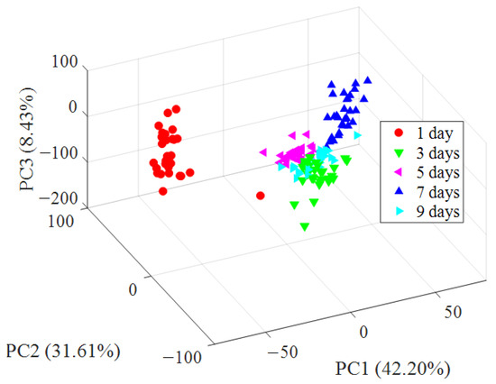 A 3D space of all oyster samples are shown in Figure 5, which shows the scatter plots of oysters which are represented by PC1 (42.20%), PC2 (31.61%), and PC3 (8.43%); the first three principal components reached 82.24%, which represents most variables’ information. As can be seen from Figure 5, the oyster samples of different storage days have a certain clustering trend in the figure, especially the oysters that had been stored for 1 day, which can be completely distinguished from other oysters in the PCA score-plots figure. Although the oyster samples in the late storage period have a certain intersection in the clustering, they still show a certain clustering trend. These phenomena can be explained, as on the one hand, the oyster samples have certain differences themselves, and on the other hand, corruption is a continuous process.