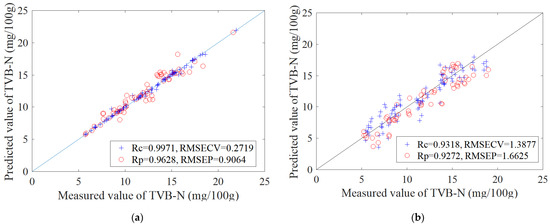 Table 1 shows the BP-ANN results of TVB-N concentration under 6–12 PCs. It can be seen from Table 1 that when the PCs are 10, the correlation coefficient of TVB-N in the prediction set (Rp) was the highest; at this time, the correlation coefficient in the calibration set (Rc) was 0.9971. Figure 4 shows the scatter plot showing a correlation between Kjeldahl nitrogen-measured values and colorimetric sensor array prediction values combined with the BP-ANN model. The signs of blue plus and red circles respectively represent the calibration and prediction data. As seen from Figure 6a, the results of measured TVB-N values and colorimetric sensor array prediction values are highly correlated in BP-ANN model after being doped with MSNs. The root mean square error of the cross-validation (RMSECV) value was 0.2719 while Rc was 0.9971; the root mean square error of the prediction (RMSEP) value was 0.9064 while Rp was 0.9628. Figure 6b shows the correlation between the measured values and the prediction values by color-sensitive materials without MSN doping. The RMSECV value was 1.3877 while Rc was 0.9318; the RMSEP value was 1.6625 while Rp was 0.9272. Compared with the results of the color-sensitive materials without MSN doping, the correlation coefficients of the calibration set and the prediction set were both significantly improved after doping, while the root mean square error of the calibration set and the prediction set was significantly reduced. Therefore, after doping with MSNs, the VOC messages of oysters with different storage times collected by colorimetric sensor array present a high relevance with TVB-N values measured by the Kjeldahl nitrogen method.