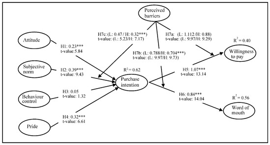 The results also showed that the path from the subjective norm to purchase intention (H7c) was significantly different between the high and low perceived barrier groups (βlow: 0.324 → βhigh: 0.481, p < 10), thereby supporting H7c. The data analysis rejected H7a; perceived barriers did not moderate the impact of purchase intention on WTP (βlow: 1.113 → βhigh: 0.908, p > 10). The results of the multigroup analyses are presented in Table 4. The hypotheses proposed by this study and the results are summarized in Table 5.