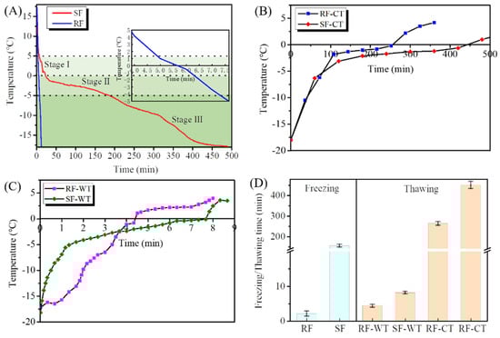 Freezing curves (A), refrigerator thawing curves (B), water immersing thawing curves (C), and freezing-thawing time (D) of red swamp crayfish. RF, rapid freezing; SF, slow freezing; CT, cold thawing; WT, water immersing thawing.