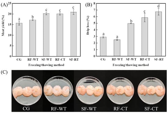 Meat yield (A), drip loss (B), and appearance (C) of crayfish meat treated by different freezing-thawing combinations. Different letters (a–c) in (A) for meat yield and letters (a–d) in (B) for drip loss indicate significant differences (p < 0.05). CG, control group; RF, rapid freezing; SF, slow freezing; CT, cold thawing; WT, water immersing thawing. n = 15.