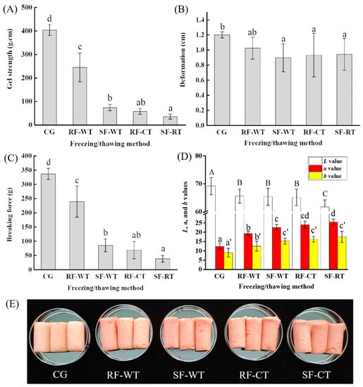 Texture properties (A–C), color (D), and appearance (E) of crayfish meat gels prepared by different freezing-thawing combinations. Different letters (a–d) in (A) for gel strength, letters (a–b) in (B) for deformation, letters (a–d) in (C) for breaking force, and letters ((A–C) for L value; (a–c) for a value; a’–b’ for b value) in (D) indicate significant differences (p < 0.05). CG, control group; RF, rapid freezing; SF, slow freezing; CT, cold thawing; WT, water immersing thawing.