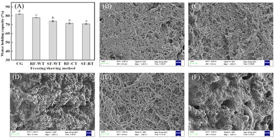 Water-holding capacity (A) and scanning electron microscopic images (B–F) of heat-induced gels of crayfish meat processed by several freeze-thawing combinations. (B): CG; (C): RF-WT; (D): SF-WT; (E): RF-CT; (F): SF-CT. CG, control group; RF, rapid freezing; SF, slow freezing; CT, cold thawing; WT, water immersing thawing. Different letters (a–d) in (A) for water-holding capacity indicate significant differences (p < 0.05).