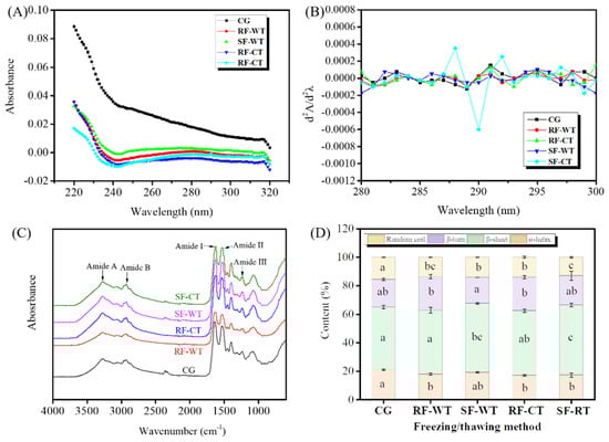 UV spectra (A), second-derivative UV spectra (B), FTIR spectrum (C), and protein secondary structures (D) of meat gels from crayfish subjected to different freeze-thawing treatments. CG, control group; RF, rapid freezing; SF, slow freezing; CT, cold thawing; WT, water immersing thawing. Different letters (a–c) in (D) for the content of protein secondary structures indicate significant differences (p < 0.05).