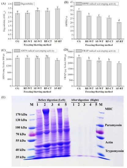 Digestibility (A), antioxidant activities (B–D), and proteins profiles (E) of meat gels from crayfish subjected to different freezing-thawing methods. Different letters (a–d) indicate significant differences (p < 0.05). Samples were prepared before (Left) and after (Right) digestion. M, marker; 1, CG; 2, RF-WT; 3, RF-CT; 4, SF-WT; 5, SF-CT. MHC, myosin heavy chain. CG, control group; RF, liquid nitrogen rapid freezing; SF, refrigerator slow freezing; CT, cold thawing; WT, water immersing thawing.