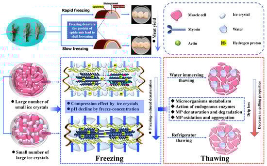 Aquatic products are among the most important foods consumed worldwide due to their presence of high-value proteins, essential micronutrients, and desirable sensory properties (delicious taste and unique aroma) [1]. However, these valuable food ingredients are highly perishable after harvest, hence their preservation becomes particularly crucial for the aquatic processing industry [2]. Freezing, as a common unit operation of food processing, can effectively reduce the water activity, inhibit microbial growth and enzyme activity, and retard the quality deterioration, thereby extending the shelf-life of aquatic products [3,4].