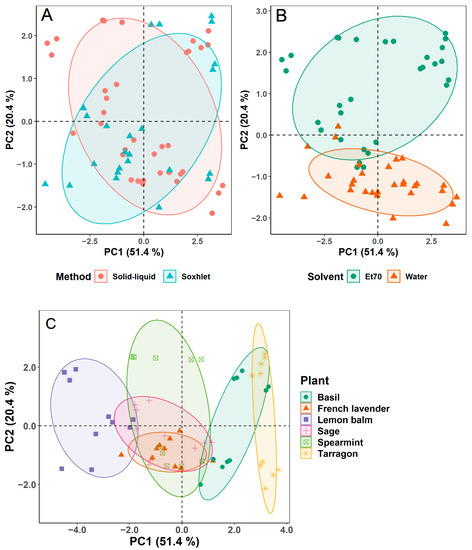 Score plots of the first two components of the principal component analysis (PCA) grouped by extraction method (A), solvent (B) and plant type (C).