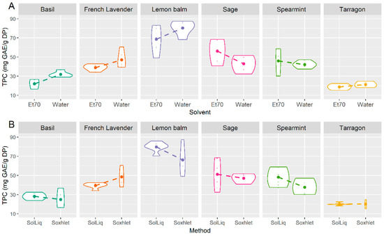Interaction plots “plant × solvent” (A) and “plant × method” (B) on the total phenolic content of plant extracts.