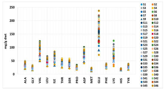 The amino acid values determined in this study are presented in Table S1 and are within the literature values, except for VAL and HIS, where the measured values were higher [6,62,63]. The VAL content ranged from 50.8–123 mg/g dwt in this study, while the previously reported values range from 35.8–60 mg/g dwt. The HIS content varied from 16.3–22.2 mg/g dwt, compared to 6.00–11.9 mg/g dwt reported in the literature (Figure 1; Table S1). The lowest content of all amino acids except MET was determined in S22, closely followed by S19 and S37. These samples contain Spirulina and excipients, especially S22 and S19, which have the most declared excipients among all the samples. It is known that a high excipient content affects the amino acid content due to the reduced amount of Spirulina [6]. Valine, ILE and HIS were present in the lowest amounts in all samples. The sample with the second-lowest content of all other analyzed amino acids was S9—a mixed sample of wheatgrass, barley grass, Spirulina and Chlorella. This result could also be due to the low microalgae content in the supplement, as cereal grasses are not as rich in protein as Spirulina and Chlorella [64,65]. These results suggest that, combined with elemental composition, the amino acid content could distinguish authentic samples from adulterated ones. The highest values of ALA, GLY, VAL, LEU, ILE, THR, SER, ASP and TYR were found in S36 and S40, PRO and LYS were highest in S6, PHE in S8, HIS in S28, MET in S39 and GLU in S46—all were declared as pure Spirulina products.