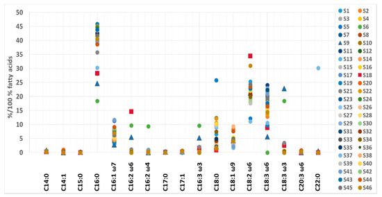 Like elemental and amino acid composition, certain samples stood out regarding TFA content (Figure 2). According to median and associated IR values, anomalously high levels of C15:0 (0.22% of TFA), C16:2 ω-6 (9.71% of TFA), C16:2 ω-4 (9.38% of TFA), C16:3 ω-3 (9.58% of TFA) and C18:3 ω-3 (18.4% of TFA) were found in S6. Additionally, in the same sample, anomalously low levels of C16:0 (18.4% of TFA), C17:1 (< LOD of TFA) and C18:3 ω-6 (< LOD of TFA) were observed, suggesting possible adulteration. S19 contained unusually high levels of C18:0 (25.8% of TFA), and low values of C17:1 (< LOD of TFA), C18:2 ω-6c (12.1% of TFA) and C18:3 ω-6c (9.72% of TFA); likewise, S37 had lower amounts of C18:2 ω-6c (11.1% of TFA) and a marked deviation in its C22:0 content (30.2% of TFA). The presence of various excipients could explain these differences. However, for S37, there remains the possibility of adulteration since it contains high levels of C22:0 FA, which was otherwise detected only in S6 (0.27% of TFA, possibly adulterated), and in the mixed sample S9 (0.59% of TFA), which contains wheatgrass, barley grass, Spirulina and Chlorella. Sample S9 also stands out due to its high content of C14:0 (0.84% of TFA), C18:3 ω-3 (22.8% of TFA), C16:2 ω-6 (5.52% of TFA), and C16:3 ω-3 (5.27% of TFA) and low content of C16:1 ω-7 (2.75% of TFA), C16:0 (24.6% of TFA) and C18:3 ω-6 (5.69% of TFA).