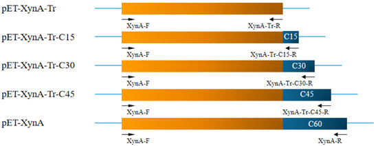 To investigate the effects of length of the C-terminal region on catalytic activity, three variants with different C-terminal peptides named XynA-Tr-C15, XynA-Tr-C30, and XynA-Tr-C45 were generated using the corresponding primer pairs, respectively (Figure 1 and Table S1). After being digested by EcoR I and Not I, these gene fragments of three variants were ligated into the pET-28a(+) vector and transformed into E. coli BL21 (DE3). The positive transformants harboring pET-XynA-Tr-C15, pET-XynA-Tr-C30, and pET-XynA-Tr-C45 were confirmed by DNA sequencing (GENEWIZ, Suzhou, China).