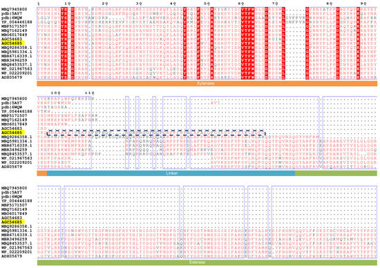The amino acid sequence alignment regarding XynA and C-terminal region C60 with the other homologous sequences. The sequences contain the xylanases from Bacteroidales bacterium (MBQ7945800, MBP5171507, MBQ7162149, and MBQ9286358.1), Aegilops speltoides sub sp. speltoides (pdb|5AY7), Thermobacillus (pdb|6WQW), Haliscomenobacter hydrossis (YP_004446188), Prevotella sp. (MBQ5981334.1, MBR6716339.1, MBR3496259, and MBQ8453537.1), Bacteroides intestinalis (WP_021967563), and Bacteroides cellulosilyticus (WP_022209201). The same amino acids are marked in dark red and red. The bottom orange rectangle is the xylanase domain, the blue rectangle is the linker region, and the green rectangle is the esterase domain. The dark blue dashed box marked in the sequence is C60.