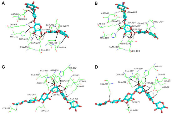 Using SWISS-MODEL software, we failed to obtain the protein structure of C60, because no matched templates were found for the target sequence. However, the three-dimensional structure of C60 was successfully predicted by Alphafold2. C60 consisted of loops and a short helix region (Figure 3), and there are 11 molecular interactions formed between C60 and XynA-Tr (Figure 3). Besides, as shown in Figure 4, the predicted structure of XynA and XynA-Tr were superimposed onto the xylanase-X5 structure (PDB code: 1R87) from the Geobacillus stearothermophilus and xylanase-X6 structure (PDB code: 4pmd) from Caldicellulosiruptor bescii, respectively. For X5, 21 hydrogen bonds were formed in the active-site networks of XynA (Figure 4A), while 20 hydrogen bonds were seen in XynA-Tr (Figure 4B). In terms of X6, there are 17 hydrogen bonds and 16 hydrogen bonds found in XynA and XynA-Tr (Figure 4C,D), respectively. The increase of hydrogen bonds in XynA might result in a higher affinity between active residues and substrate, which is in correspondence with previous ITC analysis [10].