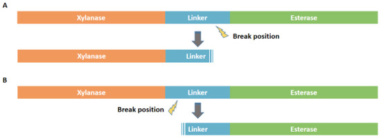 Schematic diagram of the formation of C60. (A) The linker located at the C-terminal of xylanase after breaking. (B) The linker located at the N-terminal of esterase after breaking.