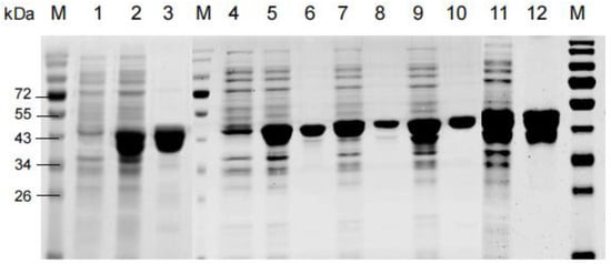 Generally, the function of linkers is determined by many factors such as its sequence length and critical residues types [13,20]. As shown in sequence alignment (Figure 2), the first 15 residues of C60 showed high identity with the C-terminal sequences of xylanases with a single domain (MBQ5171507 and MBQ7162149). In order to investigate the key residues on the effects of C60, it was divided into 4 parts and each part contained 15 residues. The variants named XynA-Tr-C15, XynA-Tr-C30, and XynA-Tr-C45 were successfully amplified, ligated into pET28a(+), and transformed into E. coli. After induction by IPTG for 12 h, the crude proteins of positive transformants showed xylanase activities. All purified recombinants of XynA-Tr-C15, XynA-Tr-C30, and XynA-Tr-C45 showed a single band of 39.09, 40.66, and 42.45 kDa by protein SDS-PAGE analysis (Figure 6), respectively, which are identical to their theoretical molecular weight values.