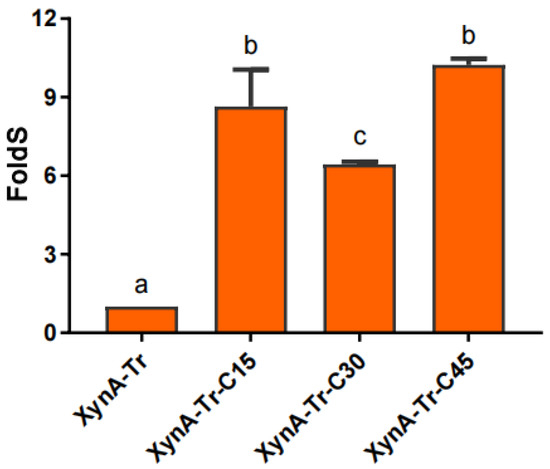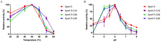 Similar to XynA-Tr, the optimal temperature of XynA-Tr-C15, XynA-Tr-C30, and XynA-Tr-C45 were still 45 °C (Figure 7). Besides, three variants had similar pH optima of 6.0, which is identical to that of XynA-Tr. XynA-Tr-C30 and XynA-Tr-C45 showed higher relative activity at acidic conditions (pH 5.0 and pH 5.5) (Figure 7). These results indicated that three C-terminal regions with different lengths do not affect the optimal temperature and pH, which allows these variants to remain active at a wide range of pHs and temperatures. Besides, the specific activities of XynA-Tr-C15, XynA-Tr-C30, and XynA-Tr-C45 were 8.65, 6.44, and 11.24 fold of that of XynA-Tr (Figure 8), which is similar to that of C60 [10]. There was no significant difference between XynA-Tr-C15 and XynA-Tr-C45 by t-test analysis. In consideration of atom economy, increasing the catalytic efficiency by fusing with C15 is a preference for molecular modification. The lower specific activity of XynA-Tr-C30 is might due to the unique helix secondary structure in the C30 region (Figure 3), which is needed to be studied in further research.