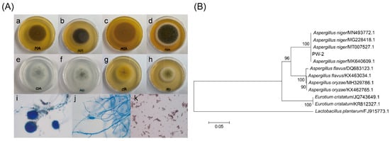 The morphological and molecular identification of Aspergillus niger PW-2 isolated from Pingwu Fuzhuan brick tea. (A) Colony feature and microscopic feature of isolated Aspergillus niger PW-2: colony feature after 4 days at 25 °C on PDA (a,b), MEA (c,d) and CYA (g,h), and colony feature after 7 days at 25 °C on CDA (e,f); morphologic characteristics of conidiophores (i), septate hyphae asymmetrically branched (j) and conidia (k) of Aspergillus niger PW-2 under a light microscope. (B) Neighbor-joining phylogenetic tree based on the dataset covering the sequences of the ITS gene of isolates and reference strains.