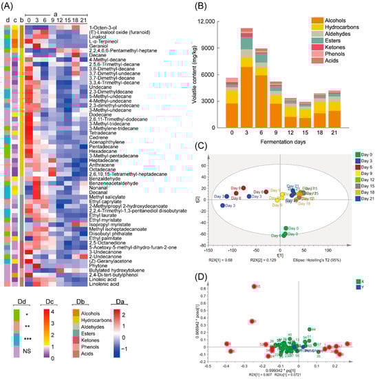 Information of the volatile compounds for the tea samples fermented by Aspergillus niger PW-2. (A) Heatmap representing the semiquantitative results (a), chemical classes (b), VIP values (c) and p values (d) of all volatile compounds (NS, p > 0.05; *, 0.01 < p < 0.05; **, 0.001 < p < 0.01; ***, p < 0.001). (B) Volatile contents of different classes in samples during fermentation. (C) Score scatter plot of PLS-DA analysis based on volatile compounds of all samples. (D) Loading scatter plot of OPLS-DA analysis based on volatile compounds of samples on Day 0 and Day 21.