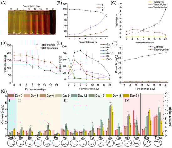Physicochemical composition changes in samples fermented by Aspergillus niger PW-2. (A) Tea infusions. (B) Color difference among tea infusions. (C) Proportion of tea pigments including theaflavins, thearubigins and theabrownins. (D) Contents of total phenols and total flavonoids. (E) Contents of GA and catechins. (F) Contents of caffeine and theobromine. (G) Contents of flavor free amino acids ((I) astringency; (II) sweetness; (III) bitterness; (IV) umami), where the line chart on the bottom displays the trend visually. GA, gallic acid; GABA, γ-aminobutyric acid; Thr, threonine; Ser, serine; Gly, glycine; Ala, alanine; Pro, proline; Val, valine; Ile, isoleucine; Leu, leucine; Tyr, tyrosine; Phe, phenylalanine; Lys, lysine; Arg, arginine; Asp, aspartate; Asn, asparagine; Glu, glutamate; Thea, theanine.