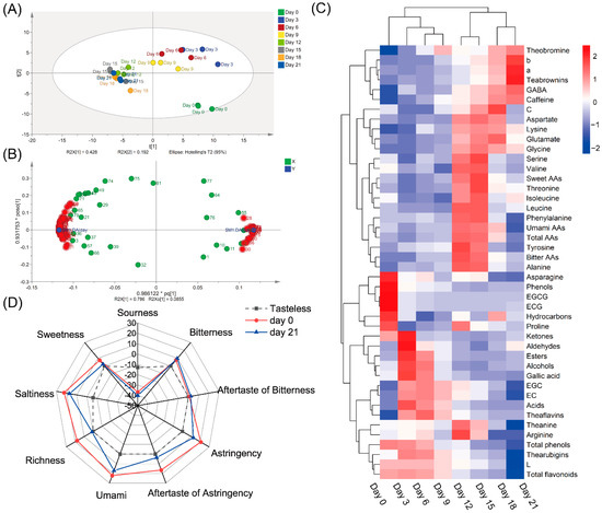The analysis of taste characteristics and the dynamics changes of metabolites in tea samples during fermentation. (A) Score scatter plot of PLS-DA analysis based on all metabolites detected in all fermented samples. (B) Loading scatter plot of OPLA-DA analysis based on all metabolites detected in samples on Day 0 and Day 21. (C) Results of heatmap analysis. (D) The taste scores of samples on Day 0 and Day 21. GABA, γ-aminobutyric acid; AAs, amino acids.