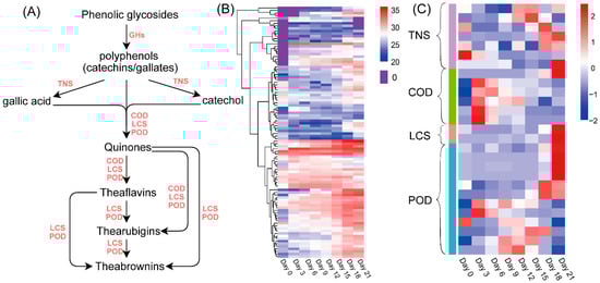 The proposed metabolic pathway of tea phenols is shown in Figure 5A, and the abundances of the related proteins are shown as heatmaps in Figure 5B,C. The heatmap of GHs (Figure 5B and Table S6) showed that the abundance of most GHs increased during the whole fermentation period and was the highest at the late fermentation stage (Days 18–21). Seven proteins in the tannase and feruloyl esterase family (TNS) were identified by manual checking (Figure 5B and Table S7). Most of these proteins had higher levels at the late fermentation stage (Days 15–21). Tea phenols including catechins, gallates, gallic acids and catechol were oxidized to quinones by catechol oxidase (COD), peroxidase (POD) or laccase (LCS) during fermentation. As shown in Figure 5A, as the fermentation degree was increased, more quinones were converted to theaflavins, thearubigins and theabrownins by COD, POD and LCS [23]. The levels of most CODs obviously increased on Day 3 of fermentation and then decreased. The levels of some proteins in the COD and POD groups also increased during the mid-fermentation stage (Days 3–18), while those of other proteins in the COD, LCS and POD groups reached their maximum levels at the end of fermentation (Day 21) (Figure 5B and Table S7).