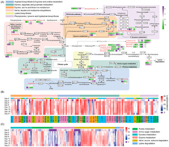 To better understand the dynamic changes in metabolites during fermentation by A. niger PW-2, the proposed metabolic pathway analyzed based on the KEGG pathway was annotated with the determined metabolites and enzymes (Figure 6A). The changes in the contents of metabolites including amino acids, differential volatile compounds and alkaloids are also included in Figure 6A. The profiles of enzymes involved in amino acid synthesis and degradation are shown by a heatmap in Figure 6B,C, respectively, and the detailed information is shown in Table S7.