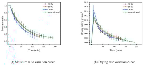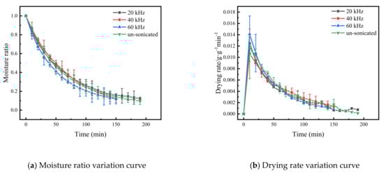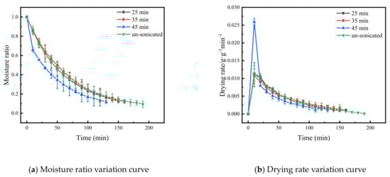 After an US treatment, the surface moisture of the samples was dried, and the samples were spread on a screen and placed in a far-infrared vacuum drying oven (WSH-60-A, Tianshui Shenghua Microwave Technology Co., Ltd., Tianshui, China). Through the preliminary experiment, the drying temperature of the drying oven was set as 55 °C, the irradiation height was 310 mm, and the vacuum degree was −60 kPa. The weighing system of the drying box is connected with the control system. The temperature, material mass and vacuum in the drying box are monitored in real time through the screen of the control system. The water content of the material is calculated through the material mass and record measurements every 10 min. The test was stopped when the moisture content of the Cistanches dropped to 10% w.b. [19], and the weighing system in the oven was used to record measurements every 10 min. To ensure the test data were accurate and the accidental errors were reduced, each test was repeated three times, and the average value was taken as the test result.