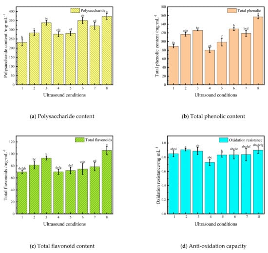 Figure 4. Effects of different ultrasonic conditions on polysaccharides, total phenols, total flavonoids and antioxidant capacity of Cistanche. Ultrasound conditions: 1 (UN-sonicated), 2 (US 25 min, 40 kHz, 180 W), 3 (US 35 min, 40 kHz, 180 W), 4 (US 45 min, 40 kHz, 180 W), 5 (US 35 min, 20 kHz, 180 W), 6 (US 35 min, 60 kHz, 180 W), 7 (US 35 min, 40 kHz, 150 W), 8 (US 35 min, 40 kHz, 210 W). The vertical bars indicate the standard deviation from the mean. The letters reveal significant differences (p < 0.05) according to the Duncan test.