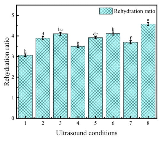 Figure 5. Rehydration rate of Cistanche slices under different ultrasonic conditions. Ultrasound conditions: 1 (UN-sonicated), 2 (US 25 min, 40 kHz, 180 W), 3 (US 35 min, 40 kHz, 180 W), 4 (US 45 min, 40 kHz, 180 W), 5 (US 35 min, 20 kHz, 180 W), 6 (US 35 min, 60 kHz, 180 W), 7 (US 35 min, 40 kHz, 150 W) and 8 (US 35 min, 40 kHz, 210 W). The vertical bars indicate the standard deviation from the mean. The letters reveal significant differences (p < 0.05) according to the Duncan test.
