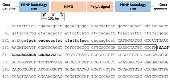 Schematic information and the location of the event-specific primers and probe in GM event KoP1. PRNP: prion protein gene, NPTII: neomycin-kanamycin phosphotransferase type II, F: forward primer, R: reverse primer, P: TaqMan probe. Lowercase letters represent the goat genomic DNA sequence, capital letters represent the NPTII sequence, bold italic letters represent the forward and reverse primers, letters in the frame is the TaqMan probe.