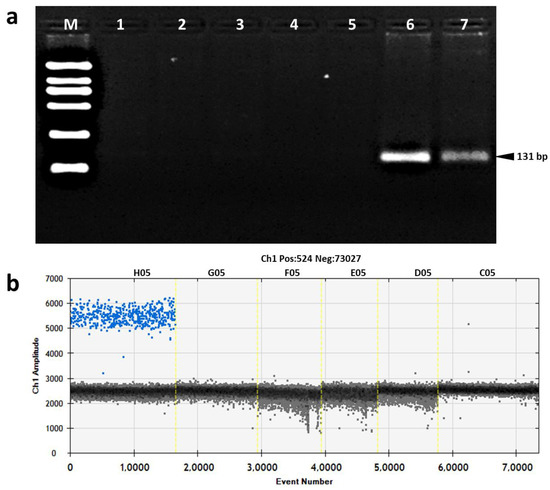 Specificity test of event-specific primer/probe set using qualitative PCR and ddPCR. (a) Agarose gel electrophoresis. Lane M, DL2000 DNA marker which contains six DNA fragments with lengths of 2000, 1000, 750, 500, 250, and 100 bp, respectively; lane 1: GM hLZ goat; lane 2: GM hLF goat; lane 3: GM hSA goat; lane 4: non GM goat; lane 5: no template control; lanes 6–7: KoP1 event. (b) Droplet readout of ddPCR. H05: KoP1 event; G05: GM hLZ goat; F05: GM hLF goat; E05: GM hSA goat; D05: non-GM goat; C05: no template control.
