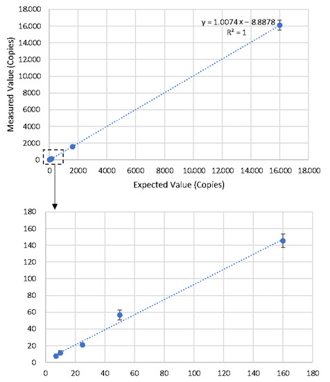 A reliable and effective dynamic range from LOQ to the highest concentration of template that could be quantified is crucial for a precise quantitative digital PCR assay. A total of nine blood genomic DNA dilutions with concentrations of 16,000, 1600, 160, 50, 25, 10, 7.2, 5, and 1 HGE/μL were used to evaluate the dynamic range of the KoP1 ddPCR assay. Except for assays containing 5 and 1 HGE template DNA per reaction, all of the other diluted DNAs were accurately quantified with the bias less than 25% (Table 3). The linear curve was drawn between the quantified and expected amounts of template DNA (Figure 3). A linearity (R2) of 1.000 was obtained within the dynamic range of 16,000–7.2 copies HGE per reaction, which was comparable with the requirement of qPCR and ddPCR [25,26,27].