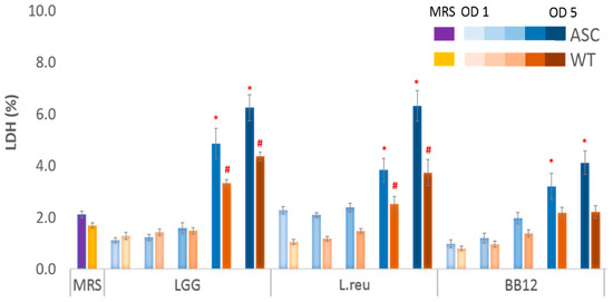 To establish the optimal OD range for bacterial growth and postbiotics treatment within our in vitro model, the cytotoxicity of the postbiotics collected from OD 1 to 5 was measured using an LDH assay. The release of LDH into the cell culture medium was used as an indicator of cell death. Compared to the MRS, the LGG collected at OD 4 and 5 resulted in 2.3- and 3.0-fold increases in the ASC cell death, and 2.0- and 2.6-fold increases in WT, while fold increases caused by the L.reu obtained at OD 4 and 5 were 1.8- and 3.0-fold in ASC, and 1.5- and 2.2-fold in WT, respectively. Treatments with the BB12 at OD 4 and 5 caused 1.5- and 2.0-fold increases in the ASC cell death, whereas OD 4 and 5 caused a 1.3-fold increase in the cell death of WT compared to the control MRS treatment. For both the ASC and WT cells, the postbiotics collected from OD 1, 2, and 3 did not cause cytotoxicity as measured by an LDH assay and, thus, were used for downstream experiments (Figure 2).