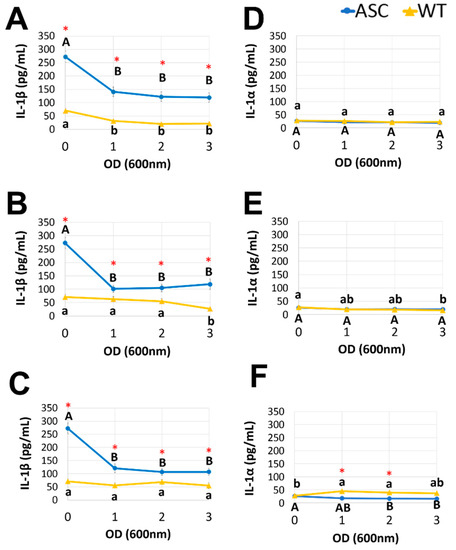 Postbiotics collected from LGG, L.reu, and BB12 suppressed the release of IL-1β in the ASC, but not the WT cells. The cytokines, IL-1β (panels A–C), and IL-1α (panels D–F) were analyzed by ELISA in supernatants collected from the ASC and WT cells after LPS priming (20 ng/mL) and cSiO2 stimulation (25 µg/mL). Prior to the LPS priming and cSiO2 stimulation, 1 × 105 cells/well were pre-treated with postbiotics collected from OD 1–3 of LGG (panels A,D), BB12 (panels B,E), and L.reu (panels C,F). The data are presented as mean ± SEM; biological triplicates were conducted. The cells treated with the MRS only were used as a negative control for postbiotic pre-treatment (designated data point OD 0). The blue lines with circles represent the ASC cells and the yellow lines with triangles represent the WT cells. The capitalized letters indicate significant differences among ASC while the lowercase letters indicate significant differences among WT (p < 0.05). * Indicates significant differences between ASC and WT (p < 0.05).