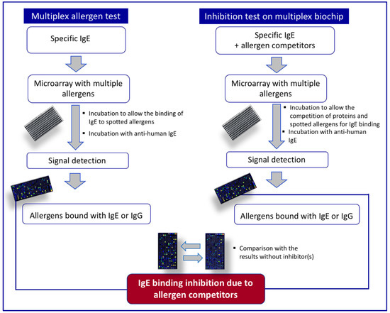 This methodology can also be considered an additional tool useful to detect allergens in a mixture, such as a total protein extract coming from an untreated or processed food sample (Figure 1). In fact, it is possible to perform competition experiments, namely inhibition tests, by preincubating the sera of allergic subjects (or specific antibodies including IgG) with the protein extract. IgE contained in the sera will bind the allergenic proteins of the extract, thus becoming unavailable for the interaction with the microarrayed molecules for which the reactivity with the sera IgE had already been established. Therefore, IgE binding to the proteins in solution is evaluated by recording the residual IgE binding to the allergen(s) spotted on the solid phase [8,97]. Unlike other immunochemical methods, such as IgE immunoblot and ELISA, an advantage of this approach is that the test provides information on many allergens with a single test and gives indications on the identity of the detected IgE-binding proteins.