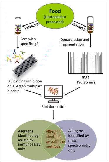 The detection of allergens contained in a food, as it is or after processing treatments, is a challenging issue [6], which can be addressed using several methods. Genetic methods allow an indirect detection of allergens. Biochemical methods, such as those based on mass spectrometry, allow a direct detection of proteins belonging to known allergenic families. However, these methods do not provide evidence indicating that these molecules are really recognized and bound by the IgE of allergic patients. Conversely, immunological methods allow the detection of molecules exposing the epitopes recognized by specific IgEs and that are required to induce IgE-mediated allergic reactions. The conventional immunological method that has been highly used for allergen detection in foods is ELISA, which is useful for the detection of a single allergen per test. The multiplex allergen microarray-based system represents an innovative method allowing the detection of many allergens, which are recognized by IgE, with a single test. These advantages do not appear to have been well exploited so far. In fact, the literature reports some examples of the use of multiplex allergen systems to identify IgE binding proteins in food extracts, but it seems that this method has not found application so far for the analysis of allergens in processed foods. Nevertheless, it shows high potentialities for this application. In fact, some features suggest it can be a very useful tool in the analysis of the effectiveness of processing procedures in the reduction of allergenicity.