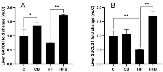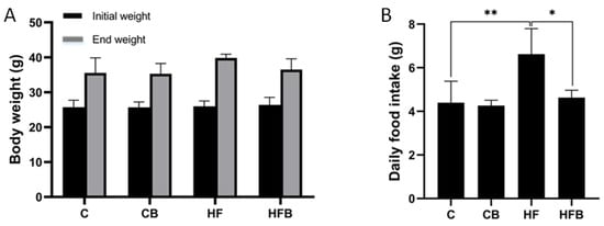 Figure 1. Effect of betaine supplementation on body weight (A) and daily food intake (B) on mice. Values are mean ± SEM (n = 9). * p < 0.05, ** p < 0.01. C: control, CB: control with 1% betaine, HF: high fat diet, HFB: HF with 1% betaine.